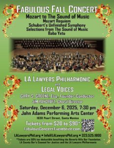From Mozart to a medley of songs from The Sound of Music, our Fabulous Fall Concert will be an unforgettable evening of fabulous music. The Los Angeles Lawyers Philharmonic and its chorus, Legal Voices, under the baton of Founder-Conductor Gary S. Greene, Esq., will perform an inspiring concert that promises a rich program to delight music lovers of all ages. The concert features a powerful lineup, including Mozart’s triumphant Requiem featuring soloists Renée Burkett (soprano), Zsofia Nemeth, Esq., (mezzo-soprano), Jeff Grief (tenor), Eric Castro, Esq., (baritone), and Benjamin Natkin, Esq., (bass-baritone); a heartfelt tribute to the 60th Anniversary of The Sound of Music, and timeless classics like Schubert’s Unfinished Symphony and Rimsky-Korsakov’s Trombone Concerto showcasing trombonist Barry Goldberg, Esq. Adding a modern twist, the orchestra and chorus — led by Choral Director Jim Raycroft — will perform the uplifting “Baba Yetu” with soloists Terrence Li, Esq. and Rebecca Bullard, Esq., —a Swahili piece originally composed for a video game that has since become a global favorite. So, let these musically talented lawyers, judges, law students and legal staff make music together and bring harmony to all.